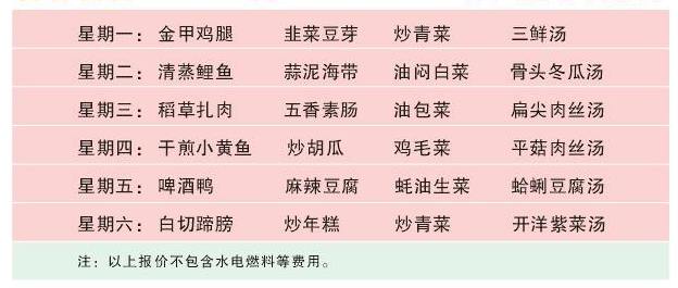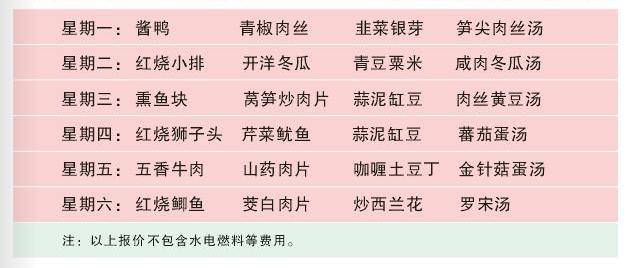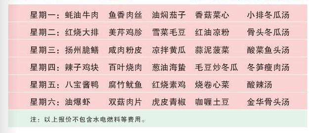 一大葷兩個素菜一湯一米飯一大葷一小葷一個素菜一湯一米飯一大葷一小葷兩個素菜一湯一米飯經(jīng)濟套餐標準報價:8.00元/餐(一大葷二素菜),米飯、湯任食。9.00元/餐(一大葷一小葷一素菜),米飯、湯任食。10.00元/餐(一大葷一小葷二素菜),米飯、湯任食。12.00元/餐(一大葷一小葷二素菜一份水果),米